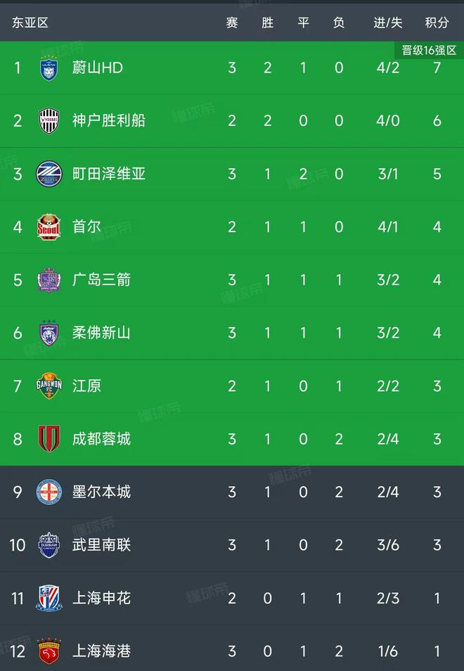 北京时间10月21日,亚冠精英联赛进入第三轮。我们来看看东亚地区积分榜的最新变化。主要信息如下:成都成都0-2新山、上海港0-2町田泽维亚、蔚山HD 1-0广岛三箭、墨尔本城2-1武里南联!亚冠精英联赛最新积分榜。今天出战的两支中超球队呈贡队和海港队在主场均未得分。成都队主场0-2不敌马来西亚新山队。本场比赛,成都队首发阵容大范围轮换。胡河涛也受伤了,而且很早就受伤了。撤退后,难以与敌整体抗衡。上半场第5分钟,阿里瓦斯闪电完成进球,下半场第62分钟,门德斯横扫再下一城。最终,成都遭遇亚冠主场首败,这也是其第二次失利。目前以1胜2负积3分暂时排名第8。新山取得亚冠首胜,以1胜1平1负积4分暂列第六。荣成主场输球,上海港主场无法占据日本队町田泽维亚的优势。比赛中没有像样的射门,他们几乎被围攻了。背面射击次数为2-16次。上半场第13分钟傅欢意外打进乌龙球,第25分钟相马由纪远射破门。最终黑格以0-2的比分落败,遭遇三连不胜。目前球队战绩为1平2负1分,排名垫底。町田泽维亚以首胜开局,以1胜2平积5分,升至第三位。港口队三场比赛未尝胜绩,排名垫底。目前排名第一的是蔚山HD。后者以1-0险胜广岛三箭在家里。金珉赫打进唯一进球。蔚山HD以2胜1平积7分晋级榜首。广岛三箭遭遇首败,以1胜1平1负积4分暂时排名第五。蔚山HD登顶积分榜榜首,并在主场战胜澳大利亚队墨尔本城队,取得主场首胜。下半场第72分钟进球后,凭借拉沙尼和卡普托的进球,2-1击败武里南联,以1胜2负3分暂时排名第9。武里南联战绩与墨尔本城相同,1胜1平1负积3分,暂列第10位。上海申花明天将进行第三轮比赛,主场迎战韩国首尔队!